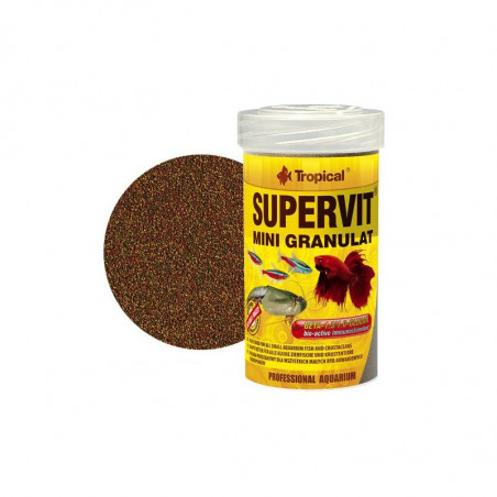 TROPICAL SUPERVIT MINI GRANULAT alimento completo en gránulos finos que hunden, destinado para la alimentación diaria de los peces pequeños y los alevines.